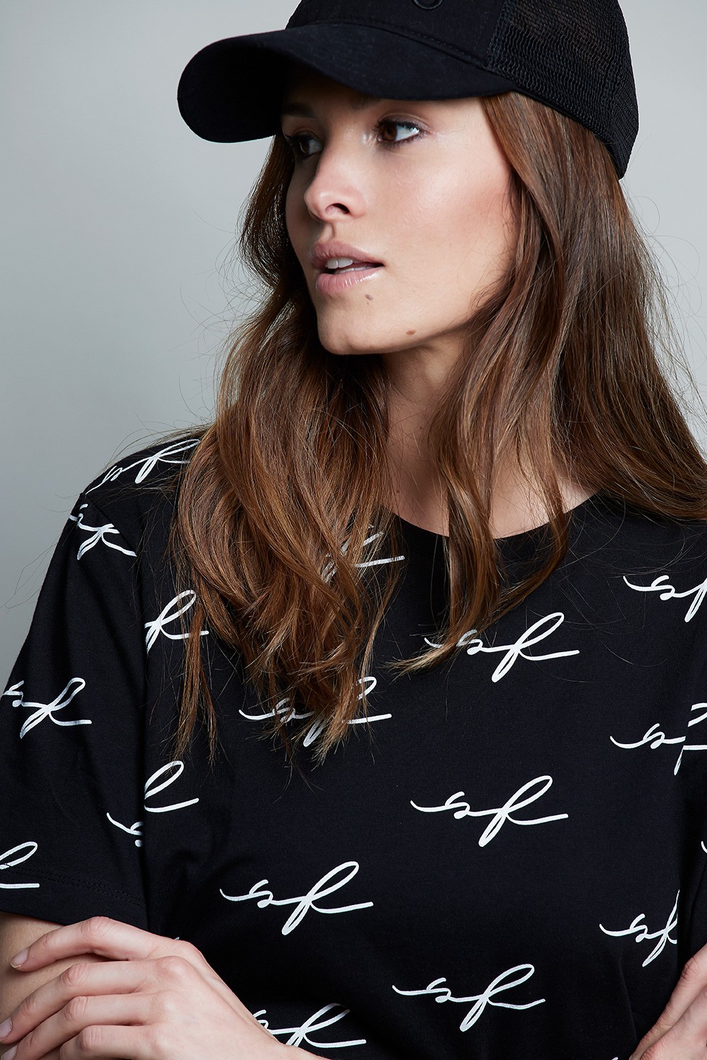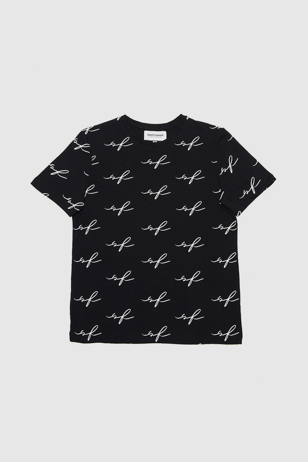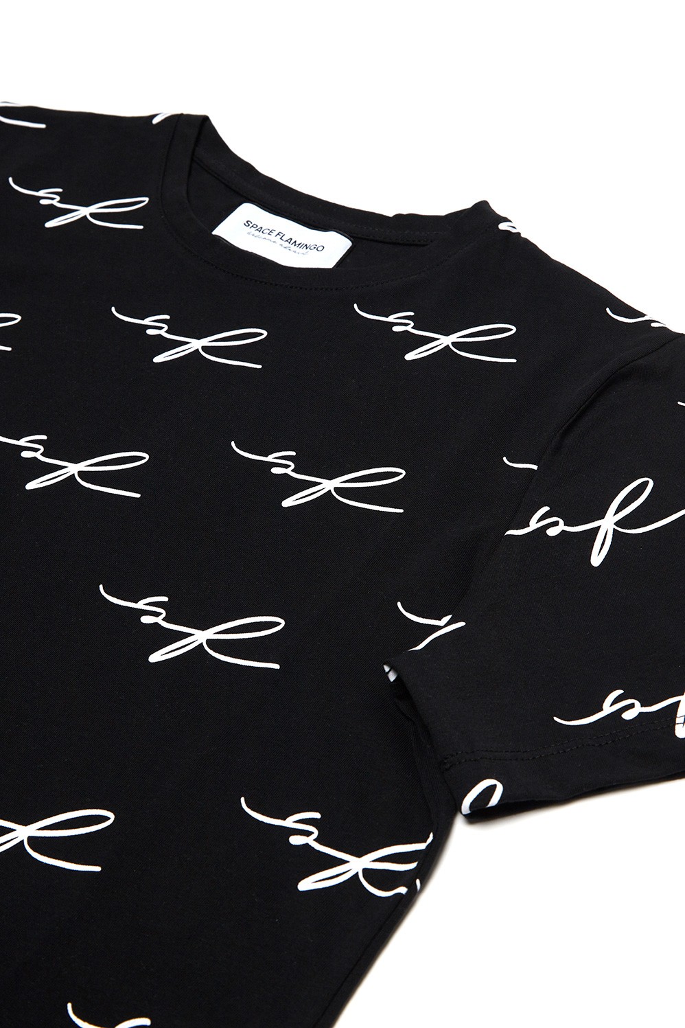 Camiseta negra de algodón, cuello redondo y manga corta.