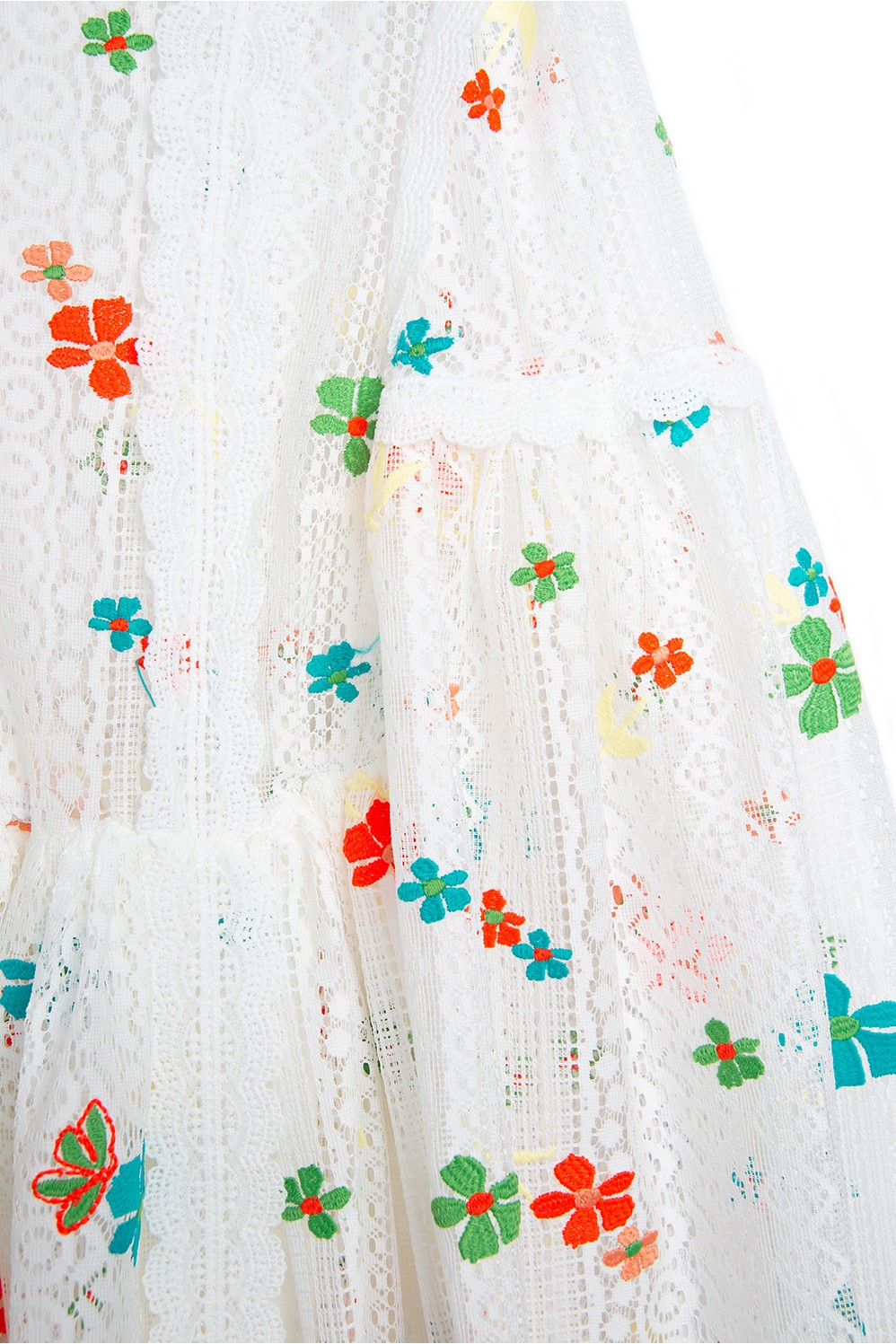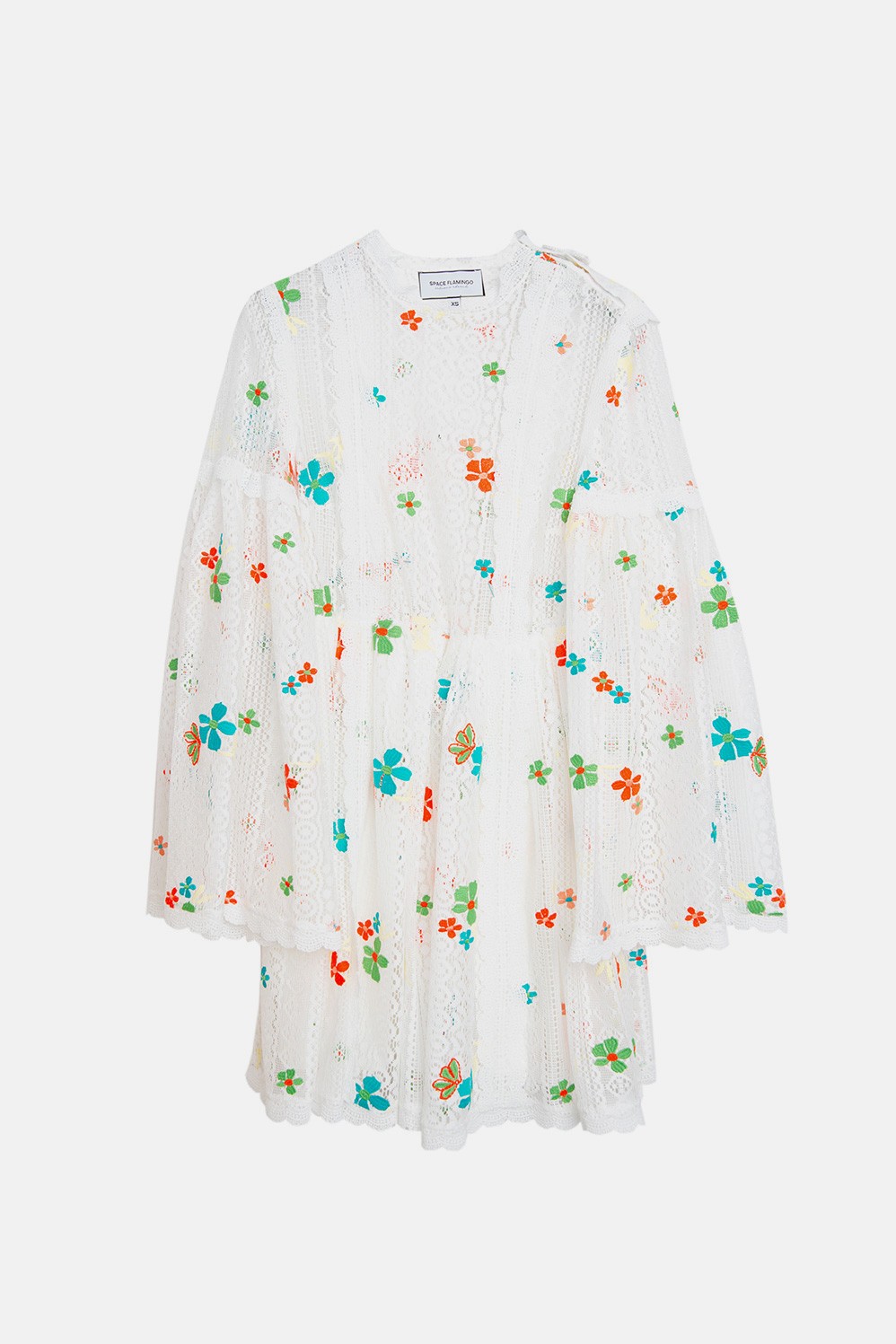 Vestido corto en tejido de encaje con flores bordadas de colores. Cuello redondo con abertura mediante corchetes en hombro izquierdo. Gran manga acampanada. Goma en cintura para un mejor ajuste.